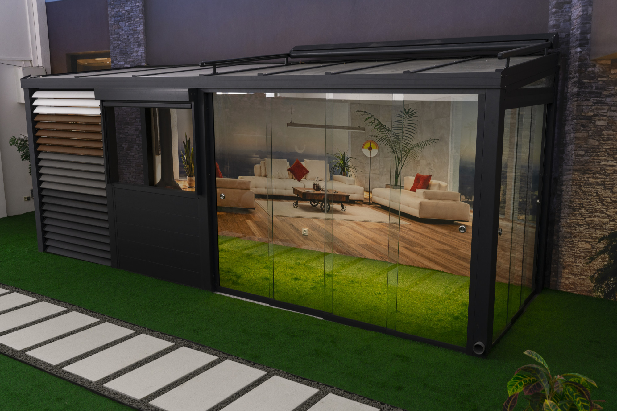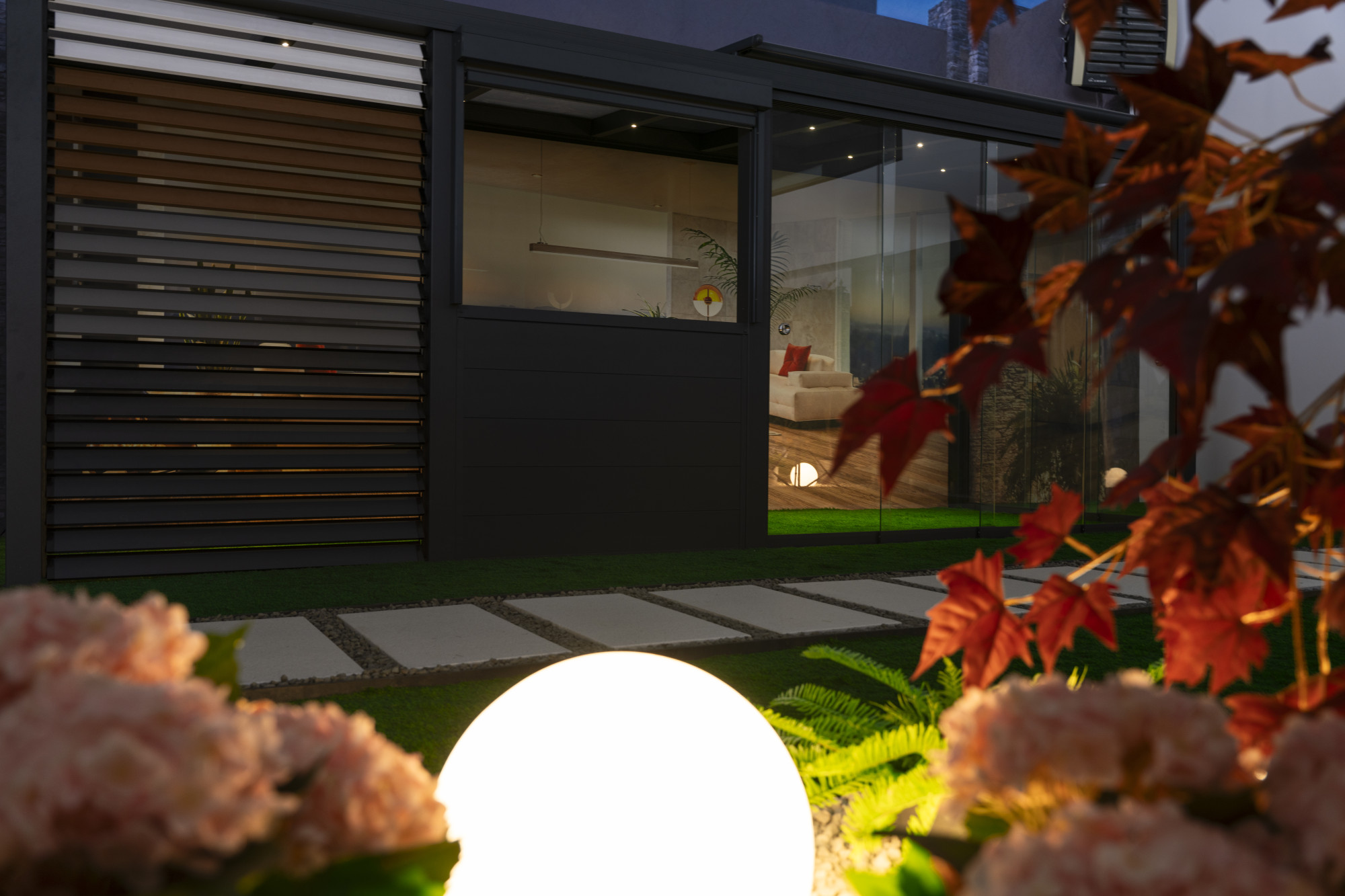 Dzięki takiej ekspozycji możesz sprawdzić, jak poszczególne elementy działają w praktyce, zobaczyć mechanizmy przesuwne, sterowanie osłonami oraz efekt oświetlenia po zmroku.
