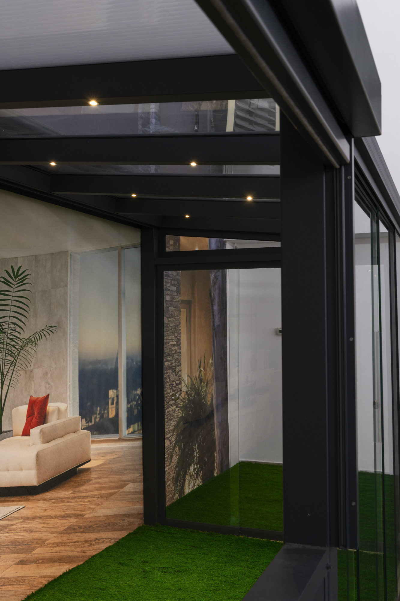 W showroomie prezentujemy w pełni wyposażone zadaszenie tarasowe, w którym zastosowano m.in.:
