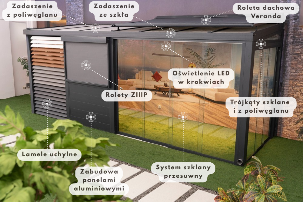 - rolety ZIIIP zapewniające ochronę przed słońcem i wiatrem,